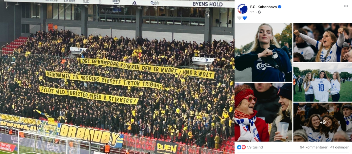 Lad os starte med en lille disclaimer om, at vi nok mere blå-hvide end blå-gule hos Kudos. Men alligevel og helt upartisk, synes vi, at det var en passende finger til vestegnsretorikken, da FCK svarede igen på Brøndby-fansenes derbybanner. Fra Brøndby lød tifoen: “Det er kampdag, klokken den er kvart i Uno & Wolt. Velkommen til Nordens største TikTok tribune. Fyldt med turister, piger & stikkere!”… (well… de fandt på det, ikke os…). Dagen efter deler FCK et opslag på sociale medier med 13 billeder af piger og kvinder, der viser deres begejstring som FCK-fans. Vi behøver ikke sige mere, vel…?
